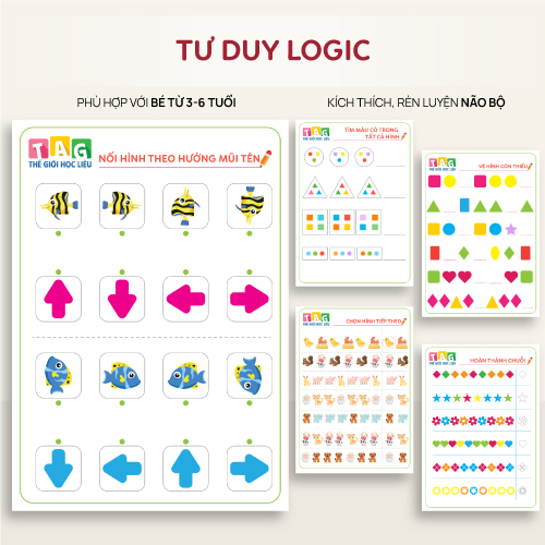 Bộ học liệu rèn não bộ – phát triển tư duy logic được thiết kế chuyên biệt cho trẻ từ 3 đến 6 tuổi, giúp bé hình thành và phát triển các kỹ năng tư duy nền tảng như suy luận logic, giải quyết vấn đề, phân loại, ghi nhớ và tư duy phản biện. Đây là một trong những học liệu “đáng đầu tư” trong giai đoạn phát triển trí não vàng của trẻ.