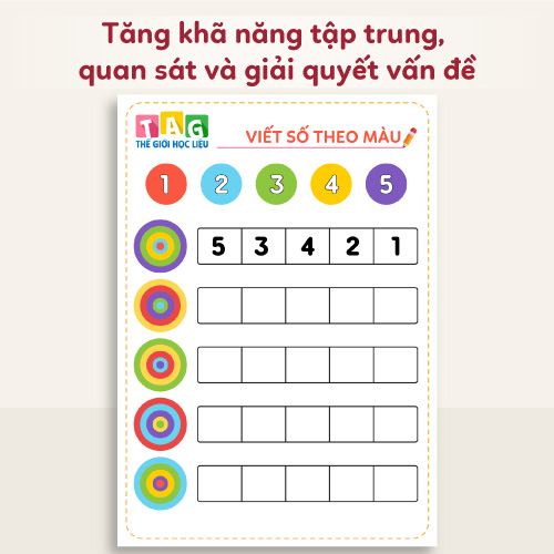 ✅ Luyện vận động tinh qua hoạt động tô màu, viết số, nối màu.