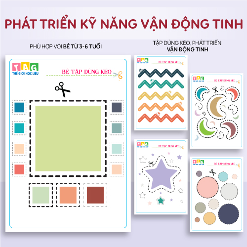 Bộ học liệu rèn kỹ năng dùng kéo được thiết kế chuyên biệt cho trẻ từ 3-6 tuổi, hỗ trợ bé thực hành cắt giấy theo cấp độ tăng dần. Không chỉ giúp bé làm quen với thao tác dùng kéo an toàn, bộ học liệu còn góp phần phát triển vận động tinh, phối hợp tay – mắt, và khả năng tập trung – một kỹ năng nền tảng trong giáo dục sớm.
