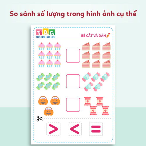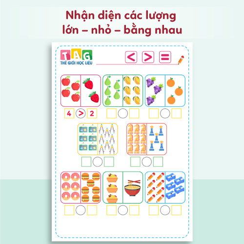 Bộ học liệu so sánh lớn – nhỏ – bằng nhau là giáo cụ mầm non giúp bé nhận biết số lượng, làm quen với khái niệm so sánh trong toán học và rèn luyện tư duy logic ngay từ sớm.