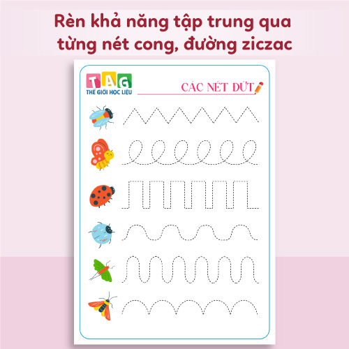 Phù hợp với trẻ mầm non từ 2 đến 6 tuổi, học liệu hỗ trợ phát triển khả năng quan sát, tập trung, tư duy logic và sự phối hợp tay – mắt. Chỉ cần 15 phút mỗi ngày, ba mẹ có thể đồng hành cùng bé xây nền tảng vững chắc cho việc học viết sau này.